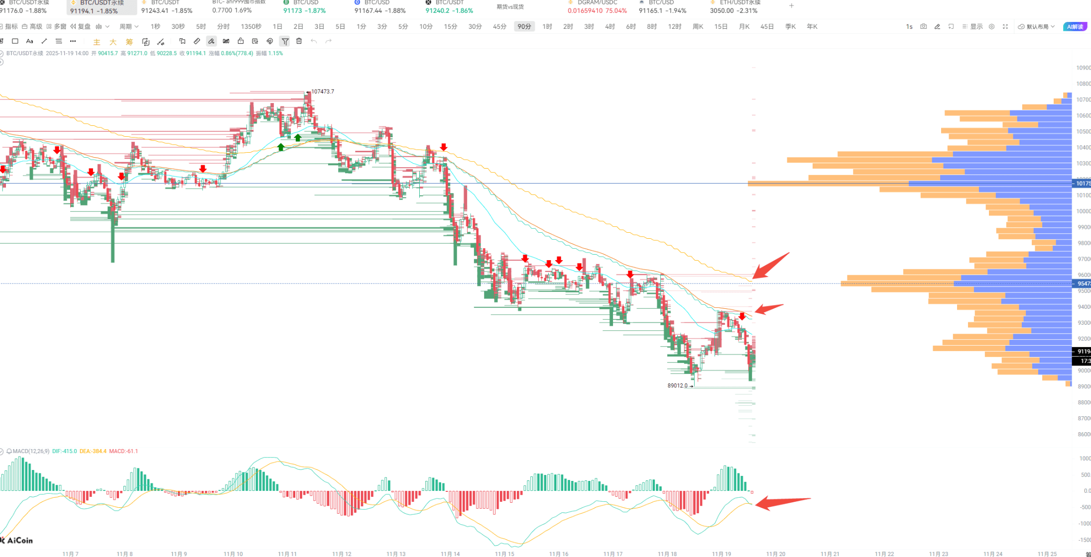 短线支撑重点盯 90000、89000 这两个关口,压力位则在 93410、95460,突破不了压力位,行情大概率还是震荡。