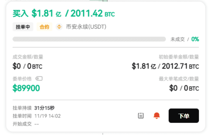 现价附近倒是挂着不少小额密集委单,但更有意思的是,今天频繁出现价值超 1.8 亿美元的大单试盘—— 这主力简直是 “戏精本精”,一会挂巨额卖单吓退散户,一会又挂买单试探承接力,折腾完就撤单,明摆着是在摸底市场深浅。