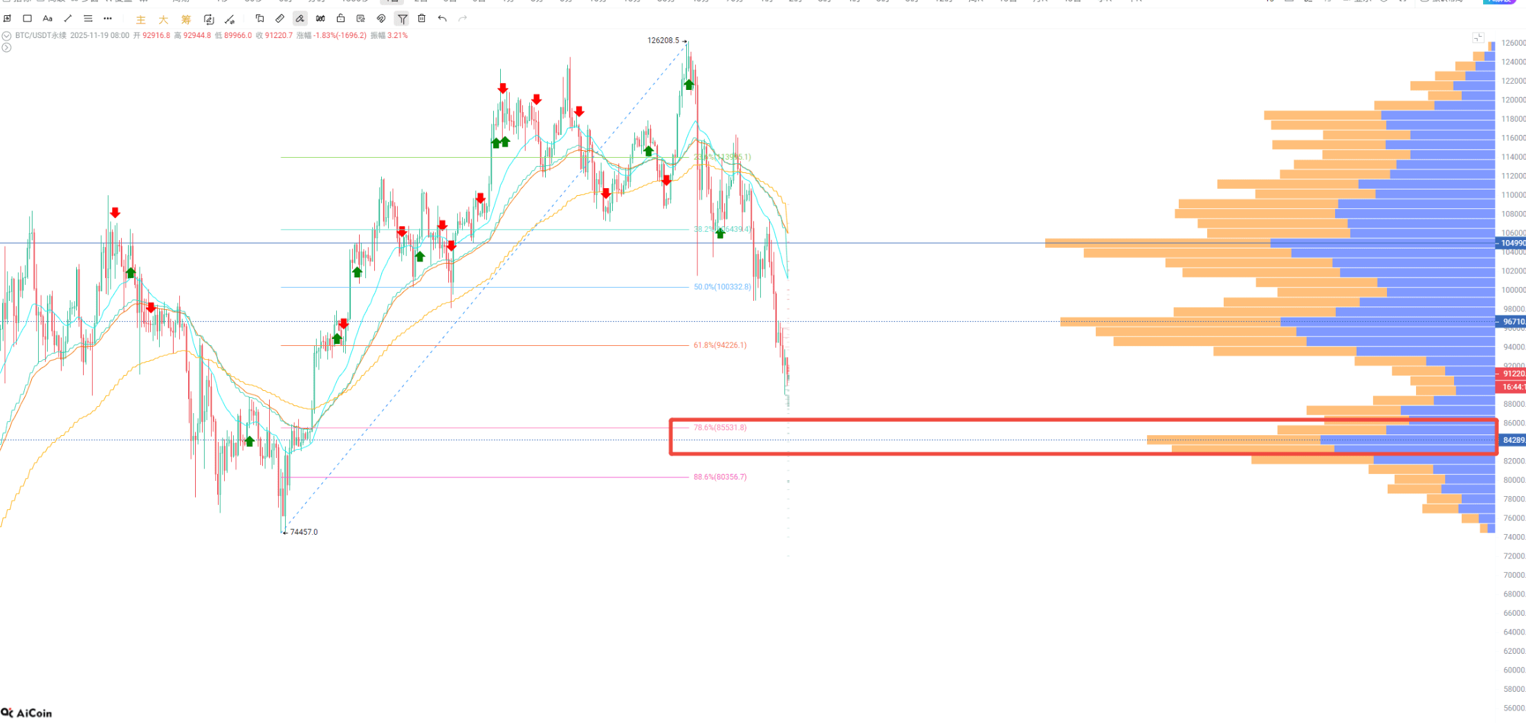 再看长线逻辑:现价正处在筹码稀缺区间,下方的强支撑在 84290~85530,这可是筹码和斐波那契回调双重背书的关键区间,撑住了才有后续反弹的可能。