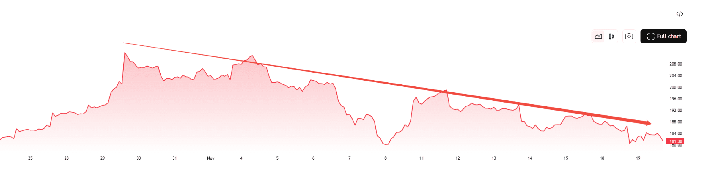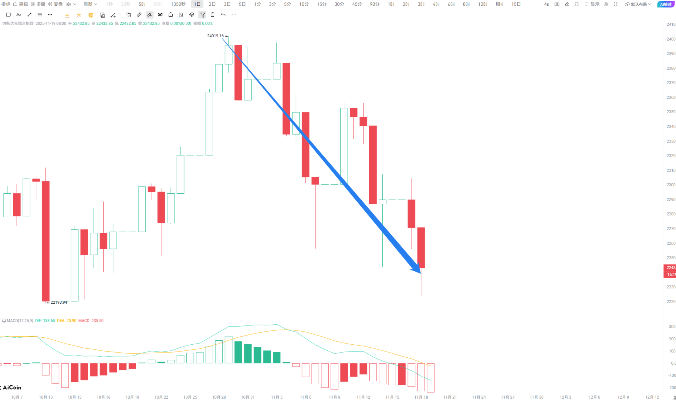 就连英伟达、微软、Meta 这些科技巨头的股票都在跌,看纳斯达克指数就知道,近期走势一片绿油油,崩不崩盘不好说,但跌势确实明显。这些科技股 10 月末就开始回调,跟财报关系不大,本质还是流动性紧张闹的。