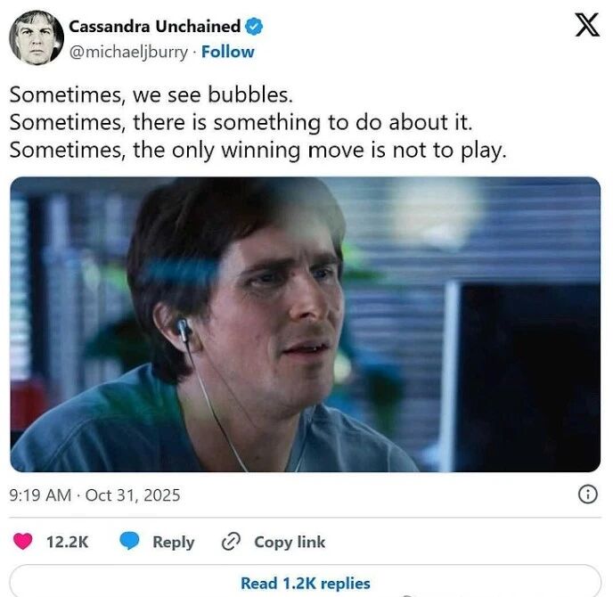 Burry himself broke a two-year silence by posting on X, with an image of his character from "The Big Short" staring at a computer, captioned: "Sometimes we can see the bubble. Sometimes we can do something about it. Sometimes the only way to win is not to play."