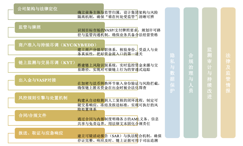 这些层面会像多米诺骨牌一样产生连锁反应,因此,收单服务商不能再只单单专注一个方面,而必须构建一套系统性的合规架构,在「去中心化」的技术世界和「中心化」的监管要求之间,搭建起一座稳固的桥梁。
