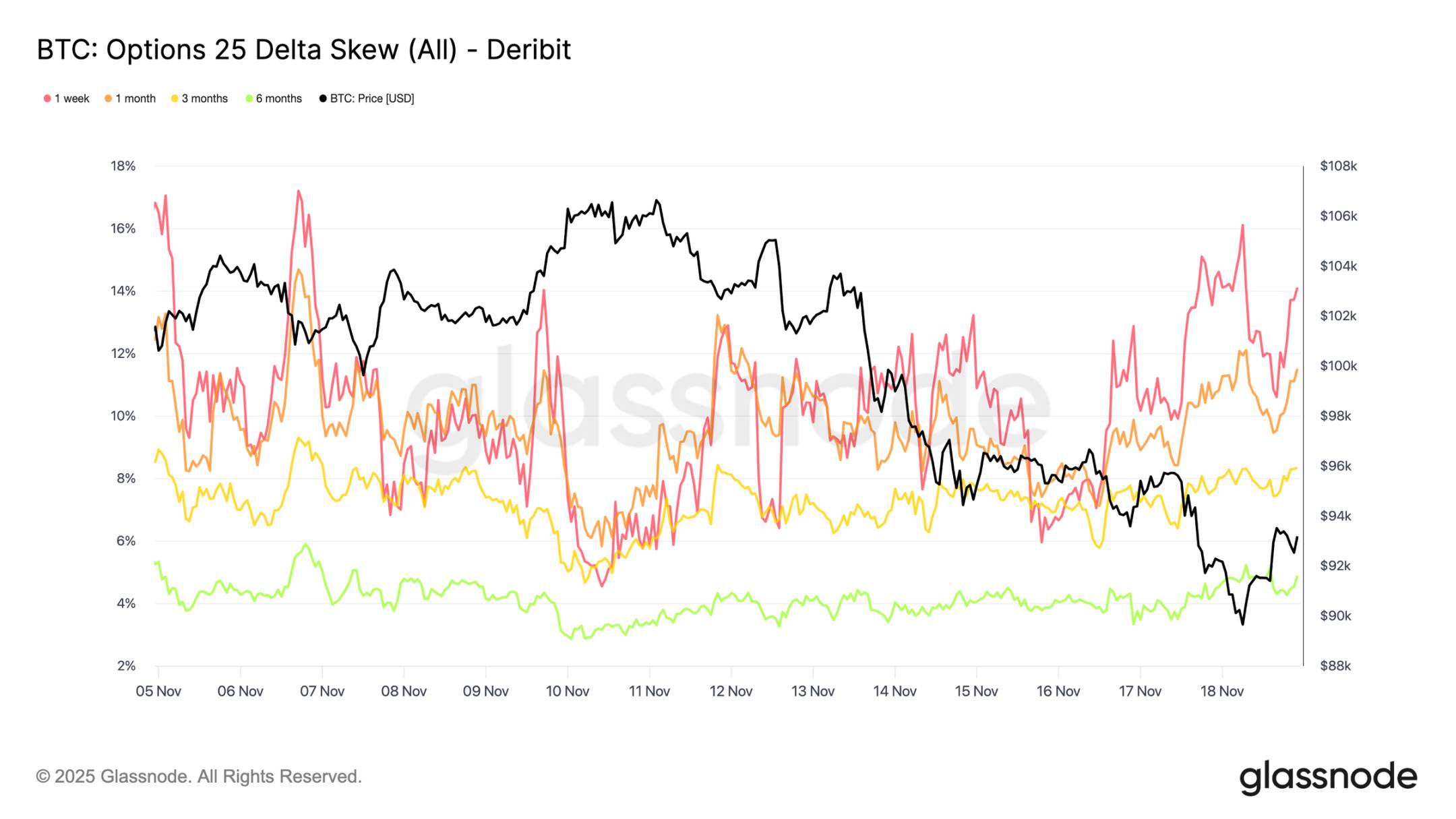 This behavior indicates that as selling pressure in the spot market intensifies, traders are willing to pay increasingly higher prices for downside protection. This trend is also consistent with the previously observed rise in short-term implied volatility.