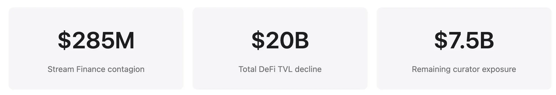在 Stream Finance 崩盘事件中,我所观察到的并非传统意义上对智能合约漏洞的复杂利用,也不是预言机操纵攻击。相反,更让人担忧的情况是:在 “去中心化” 一词的包装下,基础金融透明度出现了严重缺失。当一名外部基金经理在几乎没有任何有效监管的情况下亏损 9300 万美元,并引发了 28.5 亿美元的跨协议连锁风险;当整个 “稳定币” 生态系统即便维持了与锚定资产的汇率挂钩,其 TVL 仍在一周内暴跌 40% 至 50%。 此时我们必须承认 DeFi 当前发展状态下的一个基本事实:这个行业并未从过往的教训中吸取任何经验。