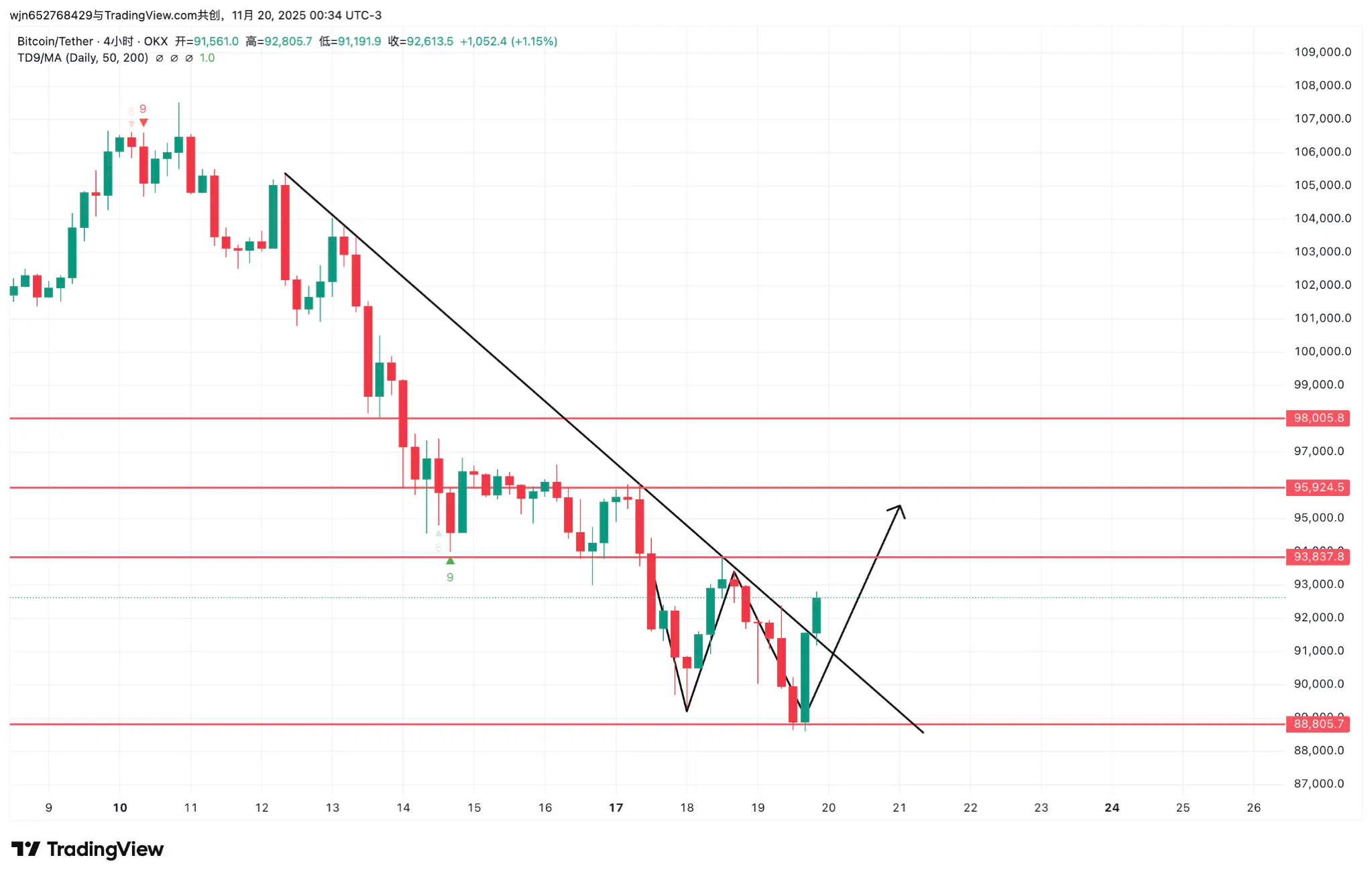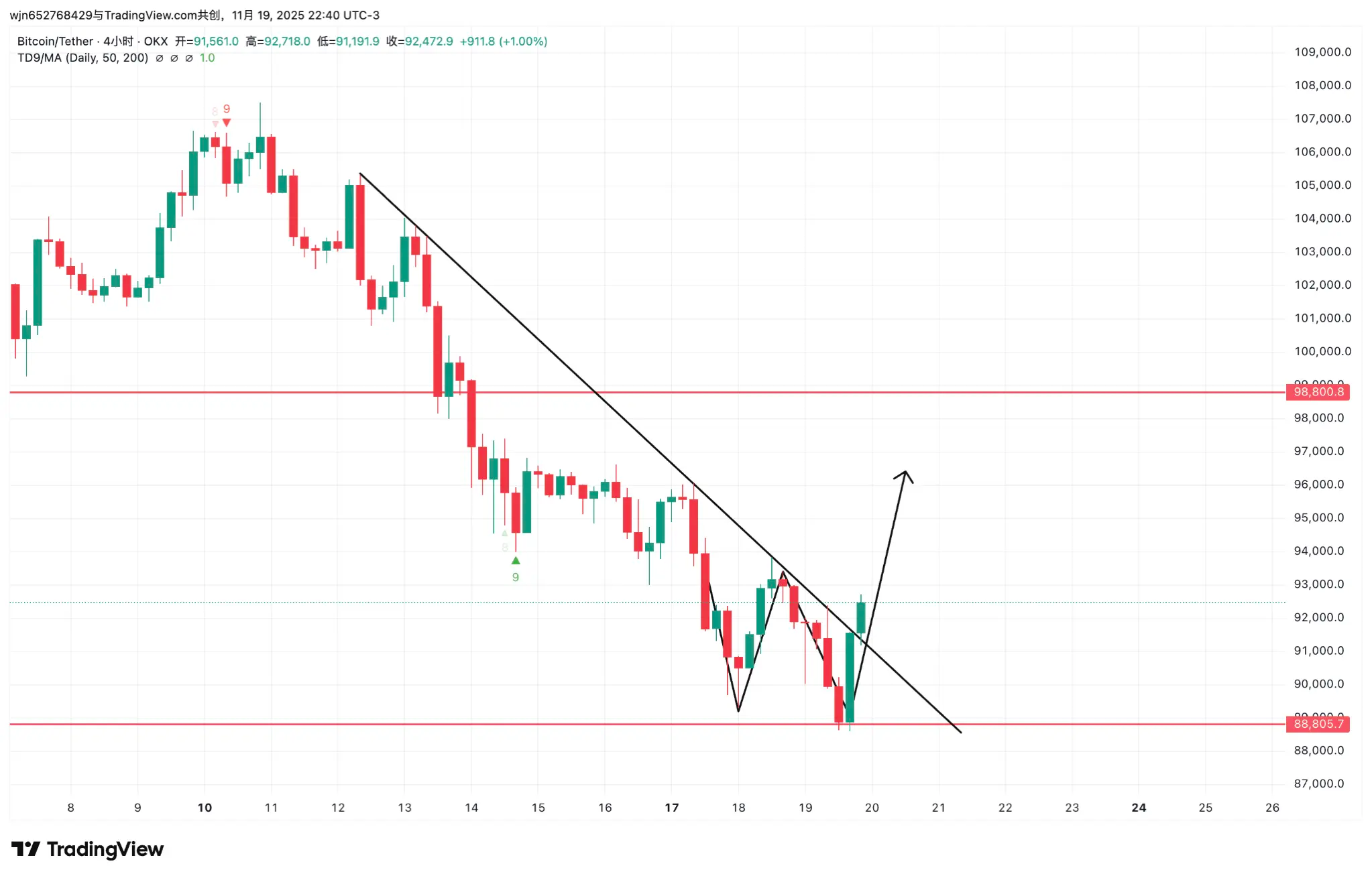 4小时级别:价格突破了下降趋势线且形成了二次探底结构,W底。当前小级别底部已经形成,继续看全面反弹
