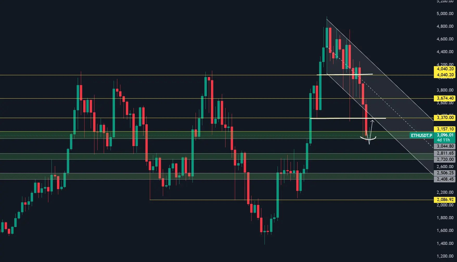 大饼周线级别:价格昨日再次下跌洗盘,低点最终确认为左侧W底颈线位,K线收下影线,此区域支撑仍然为本周的关键支撑,不跌破就看多