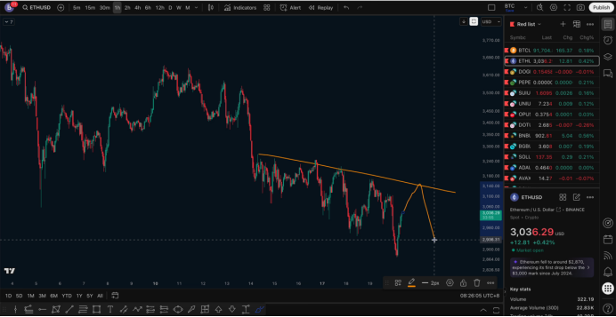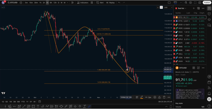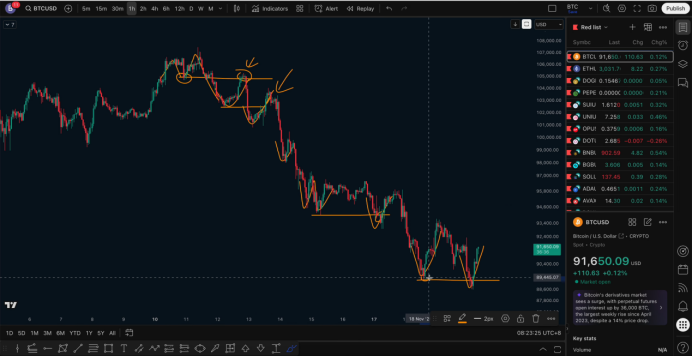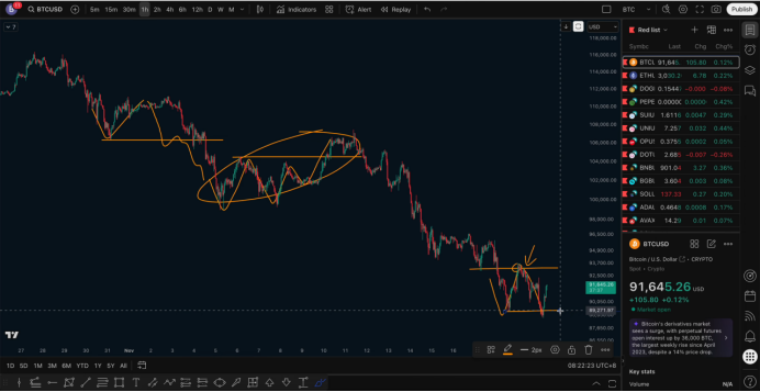 我在本周一讲过,4 小时空头扩展的 1.38~1.618 区间刚好在 89,000,目前确实已经到位,所以当时预期的两种可能走势(反弹再跌、或直接阴跌)也都符合现在的表现。