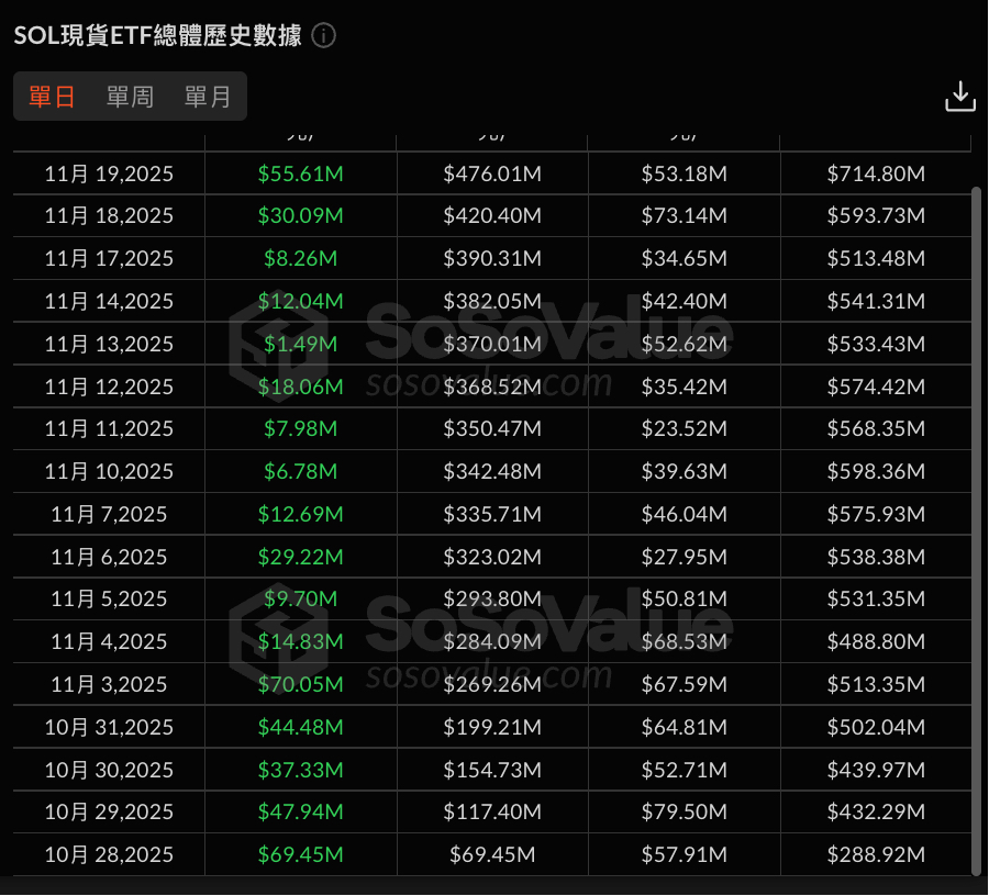 综合上述各项数据不难发现,虽然加密市场整体态势疲软,但 Solana 现货 ETF 在短短半个月内,资金净流入量便接近 5 亿美元,这一数据足以体现 SOL ETF 市场的潜力。值得一提的是,自 10 月 28 日首只 Solana ETF 上市以来,SOL 现货 ETF 每个交易日都呈现资金净流入状态,截至目前已连续 17 日实现净流入。