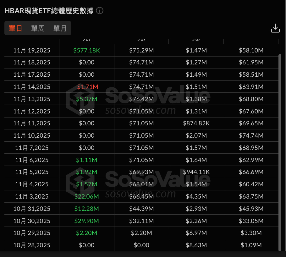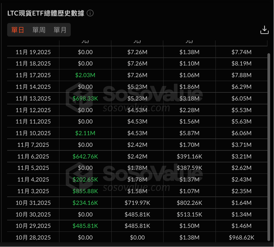 与 HBAR 相比,作为「元老级」代币的 LTC,其首个美国现货 ETF「LTCC」的处境则更为凄惨。该 ETF 同样设定了 0.95% 的管理费率,并且引入了质押机制,允许通过持有的 LTC 进行质押,从而为投资者带来链上收益。但遗憾的是,该 ETF 显然对投资者吸引力不大。截至今日,LTCC 的总资金净流入仅为 726 万美元,总净资产也不过 774 万美元。并且,从 SoSoValue 提供的数据可以看出,LTCC 单日净流入大多仅为数十万美元,甚至有超过一半的天数出现了单日零流入的情况。