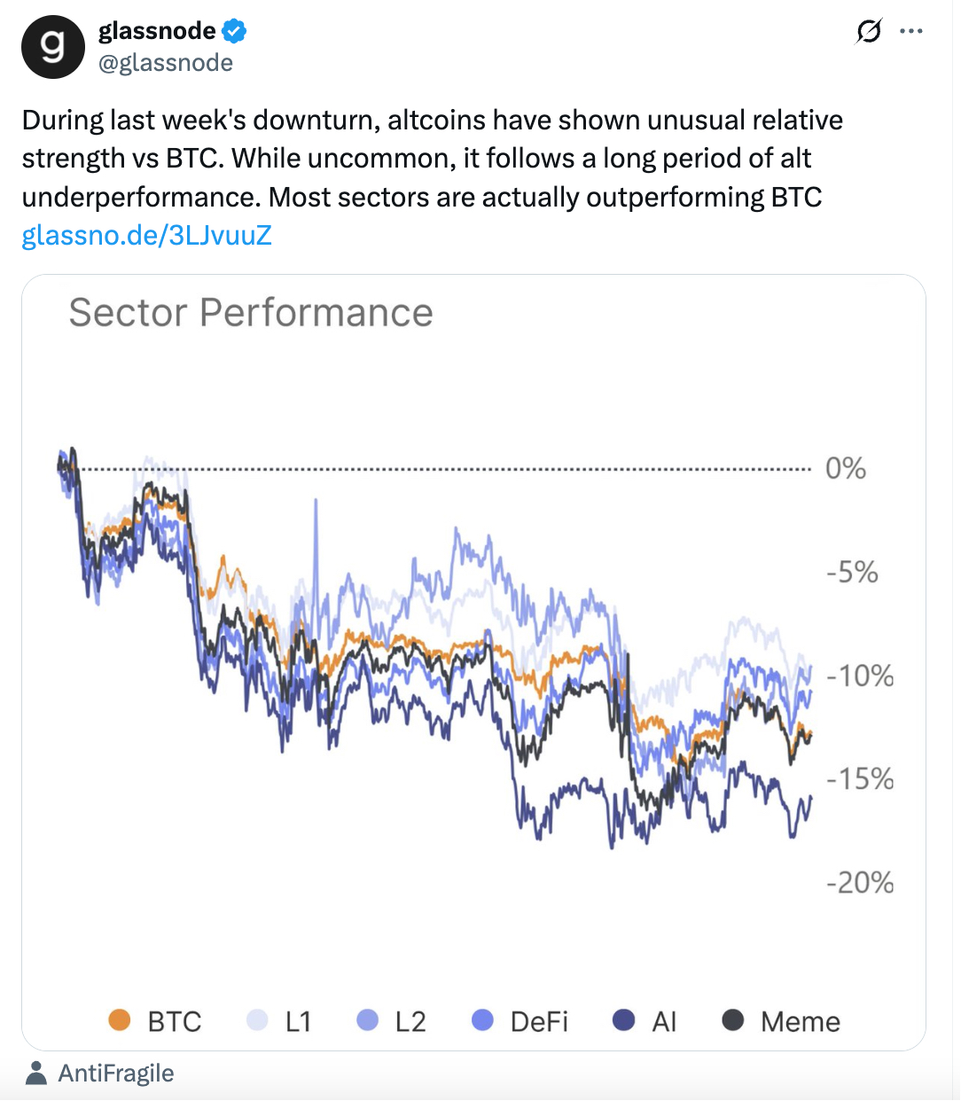 此外,虽说山寨币存在波动性较高、流动性不足等固有缺点,但在近期的下跌行情中,其相对于比特币的表现尚算坚挺。Glassnode 指出,在市场深度抛售阶段,山寨币的相对利润趋于稳定。尽管这种情况并不常见,但它是在山寨币长期表现欠佳之后出现的。事实上,近期大多数山寨币板块的表现都优于比特币。