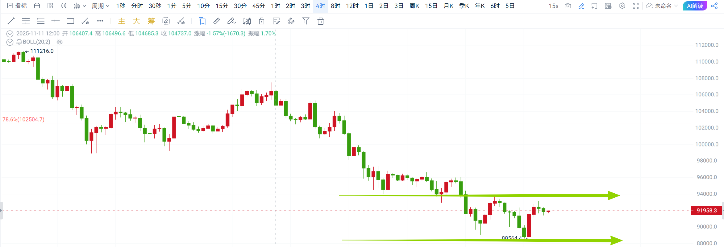 On the 4-hour level, Bitcoin's current trend is still as mentioned earlier, basically showing a downward consolidation followed by a potential breakdown, continuing the bearish rhythm. The current consolidation range is still referenced at 89,000-92,000-94,000, while Ethereum's current consolidation range is referenced at 2,900-3,050-3,150!