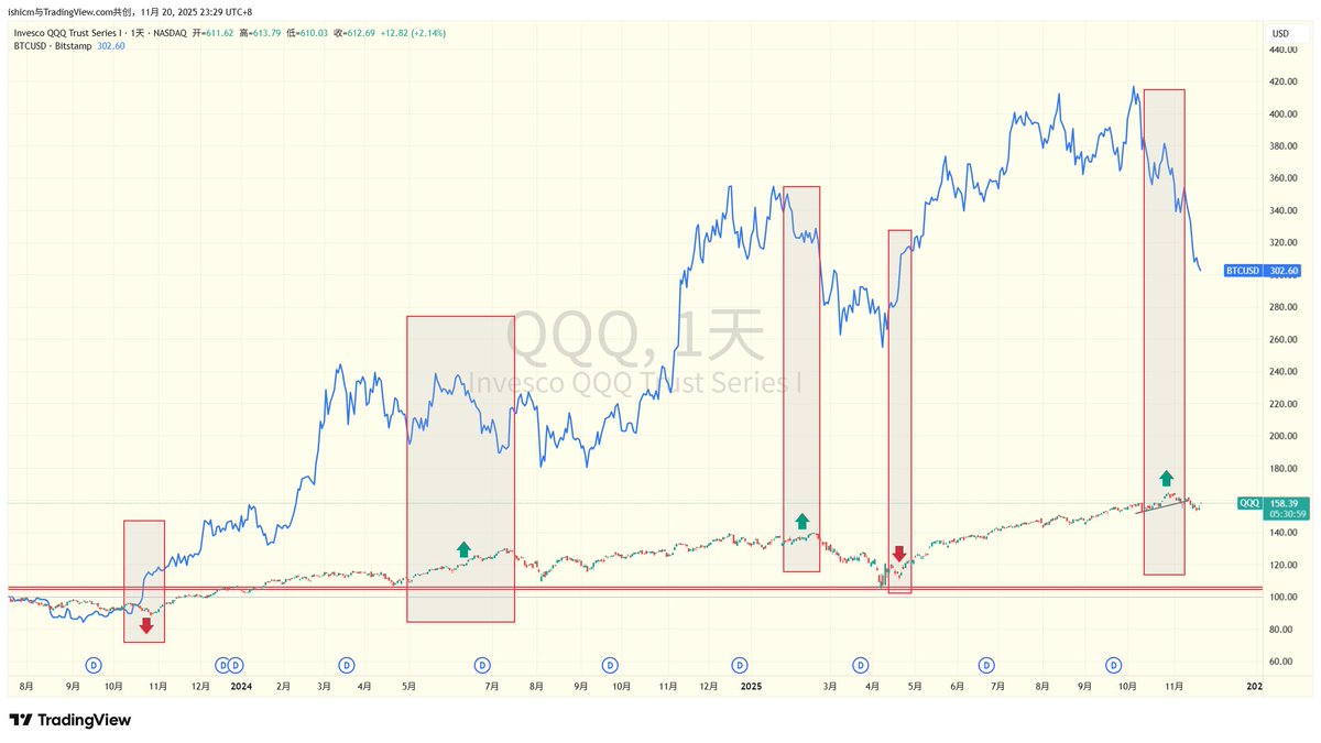 Conversely, looking at BTC's adjustments is also valid. In the three red areas, the green line represents the US stock market on the rise. However, BTC was declining, and then it continued to drop significantly.
