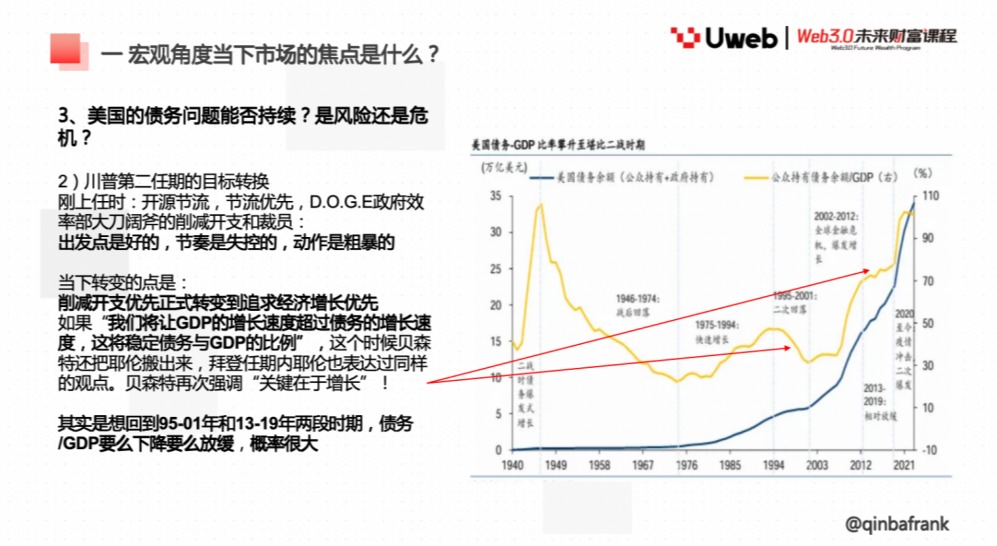 第二次:核心关注点不再优先削减开支,而是转变为追求经济增长,只需要让债务对 GDP 的比例放缓或者下降。去年美国债务 GDP 最高达到 110%,现在小幅回落到 105%,如果未来两年美国债务 GDP 比例能够降到 100% 以下,比如到 90%,那是大家是否还会认为债务是个问题?
