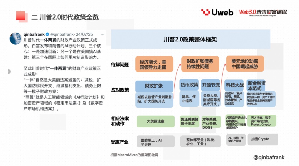 今天我主要从几个角度进行阐述。首先是从宏观角度来看,我自己所理解或认为的目前市场状态是什么?川普上台从年初到现在已经大半年时间,他在第二任期构建的政策框架是什么?在这个政策框架下,希望推动加密产业达到什么状态?