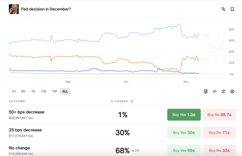 On the 17th, the target of BTC-85k and ETH-2700 was mentioned, and the speed of reaching these targets was unexpected, with the market plunging all the way down. The core reason lies in liquidity; the expectation of interest rate cuts in December has dropped to 30%, lower than when the previous article was published. Without expectations of liquidity improvement, there is no momentum for price rebounds.