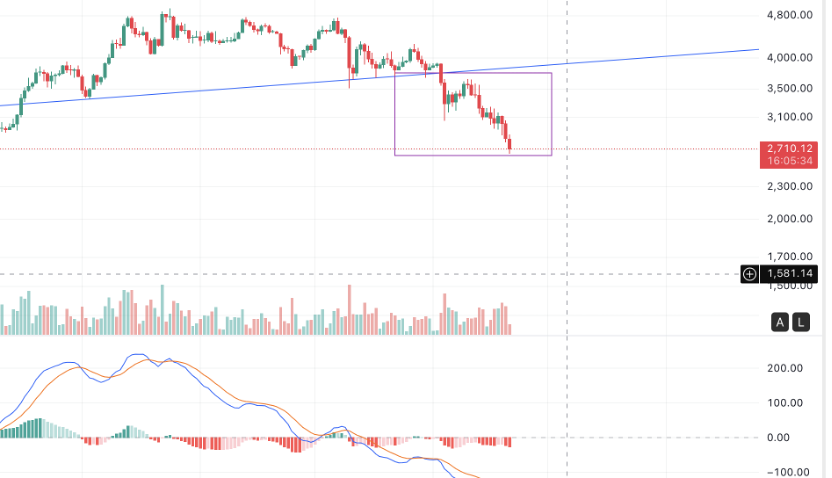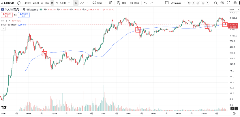 From the long-term perspective in the chart below, ETH's weekly K-line is clearly defined around the 120-week line. The current price is around 2860. In the past, when the weekly level fell to this point, there would typically be a 2-3 week consolidation. In the previous three instances when it started to fall from the top and broke below the 120-week line, as long as there was a spike below, it would definitely continue to fall. This is the fourth time.