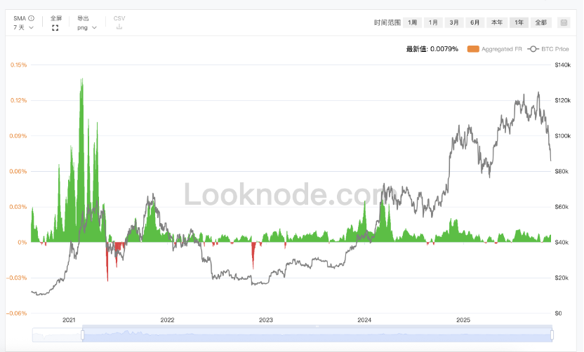 Looking at the 7-day average of the funding rates in the chart below, it becomes clearer. This sentiment indicator has been very reliable up to now. Just as I am typing this, BTC has dropped to a low of 82k, and ETH has dropped to a low of 2640+, but the funding rate is still at 0.01%, showing no signs of turning negative. Therefore, this should not be the true bottom.