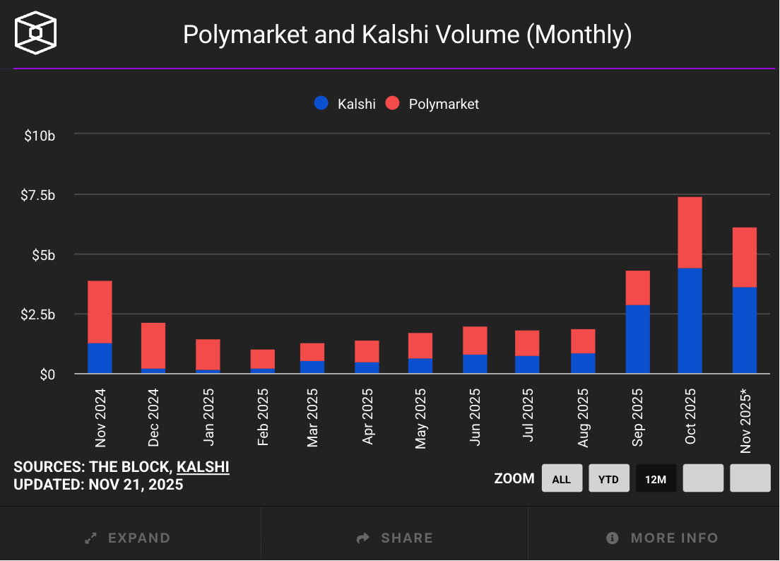 实际上,据 The Block 监测,自 9 月以来,Kalshi 的月度交易量已经超过 Polymarket。