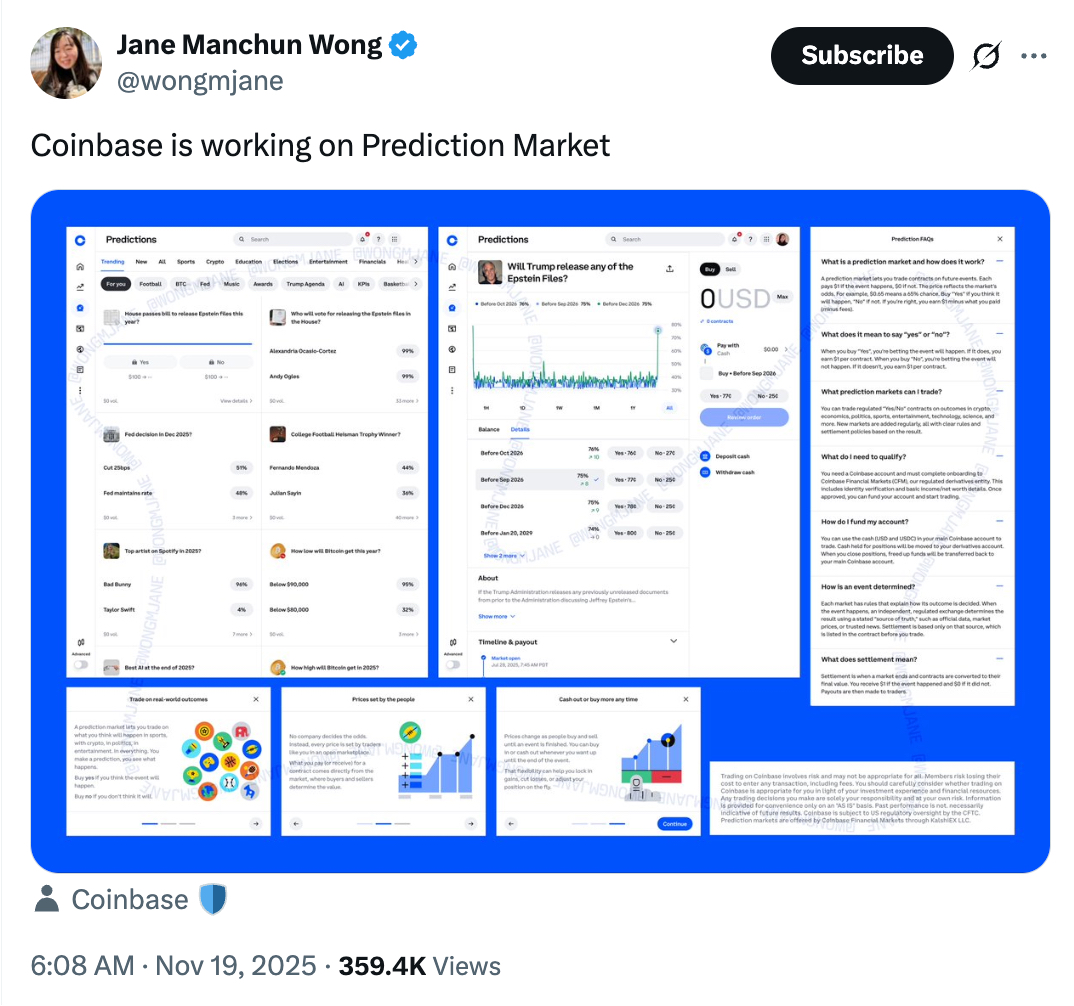 就在前日,研究员 Jane Manchun Wong 发推披露,Coinbase 正在开发由 Kalshi 提供支持的预测市场服务,其预测市场将涵盖美联储决策、加密货币价格和新闻事件等投注选项。更早之前,Kalshi 预测市场已选择 Coinbase 托管基于事件的合约中的 USDC,由 Coinbase Custody 提供安全保障。