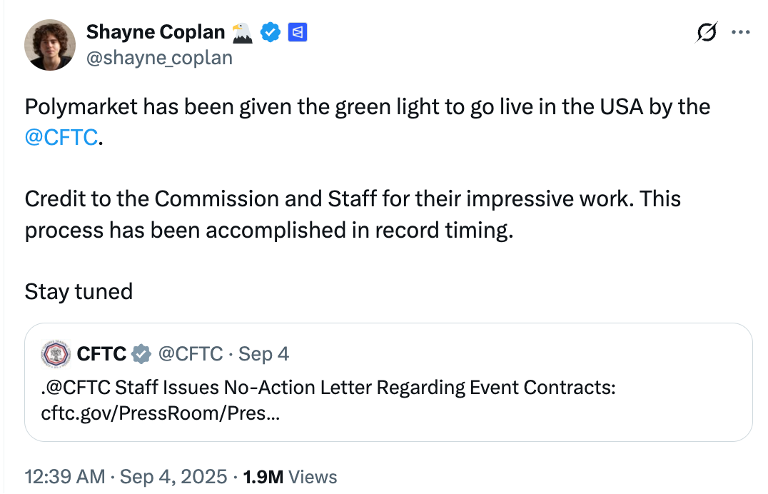 此前,Polymarket 因合规争议被联邦监管机构逐出美国市场。今年 7 月,Polymarket 斥资 1.12 亿美元收购小型交易所 QCX,计划以合法的方式重新进入美国市场。9 月初,Polymarket 首席执行官 Shayne Coplan 发推表示,Polymarket 已获美 CFTC 批准在美国上线。CFTC 已向该公司发出无异议函,允许其在美国恢复运营。
