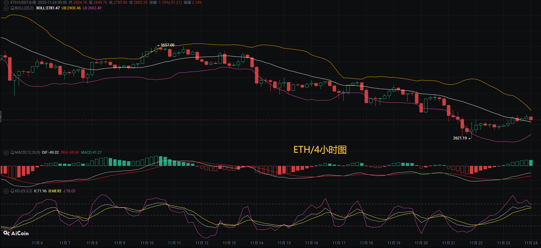 技术指标方面,4小时MACD出现底背离信号,即价格创出新低而DIF未破前低,暗示下跌动能有所减弱;日线MACD柱状图呈现缩量下跌特征,反映空方力量有所收敛。此外,4小时级别中EMA7上穿EMA30的尝试未能成功,且价格仍被120EMA(3208附近)强势压制,整体结构仍偏空,需关注能否有效突破短期均线压制以确认企稳信号。短线上方压制关注2860附近,其次关注2930区域,
