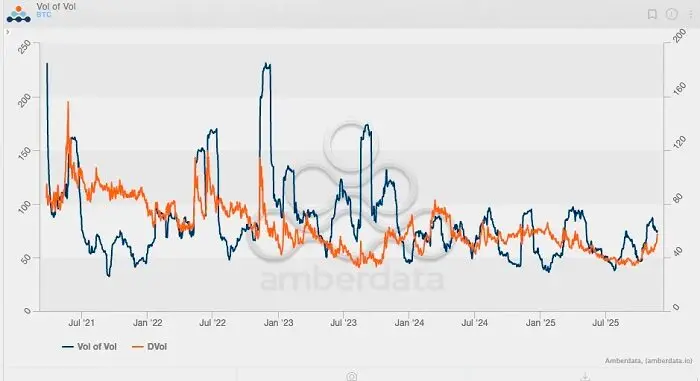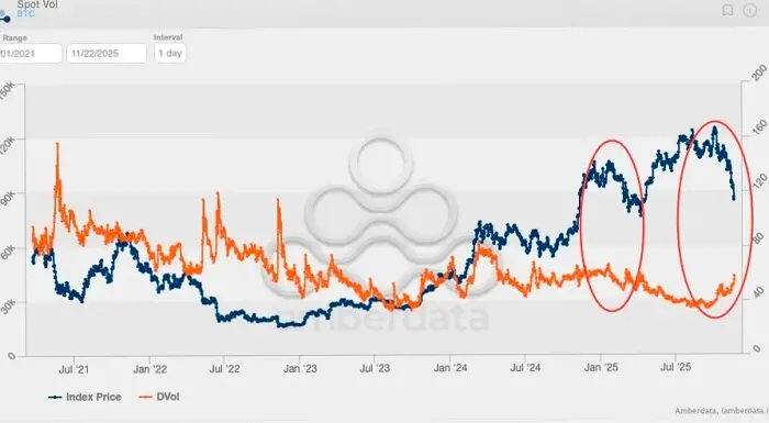 但是,过去60天情况发生变化,比特币波动率出现2025年以来的首次上升。