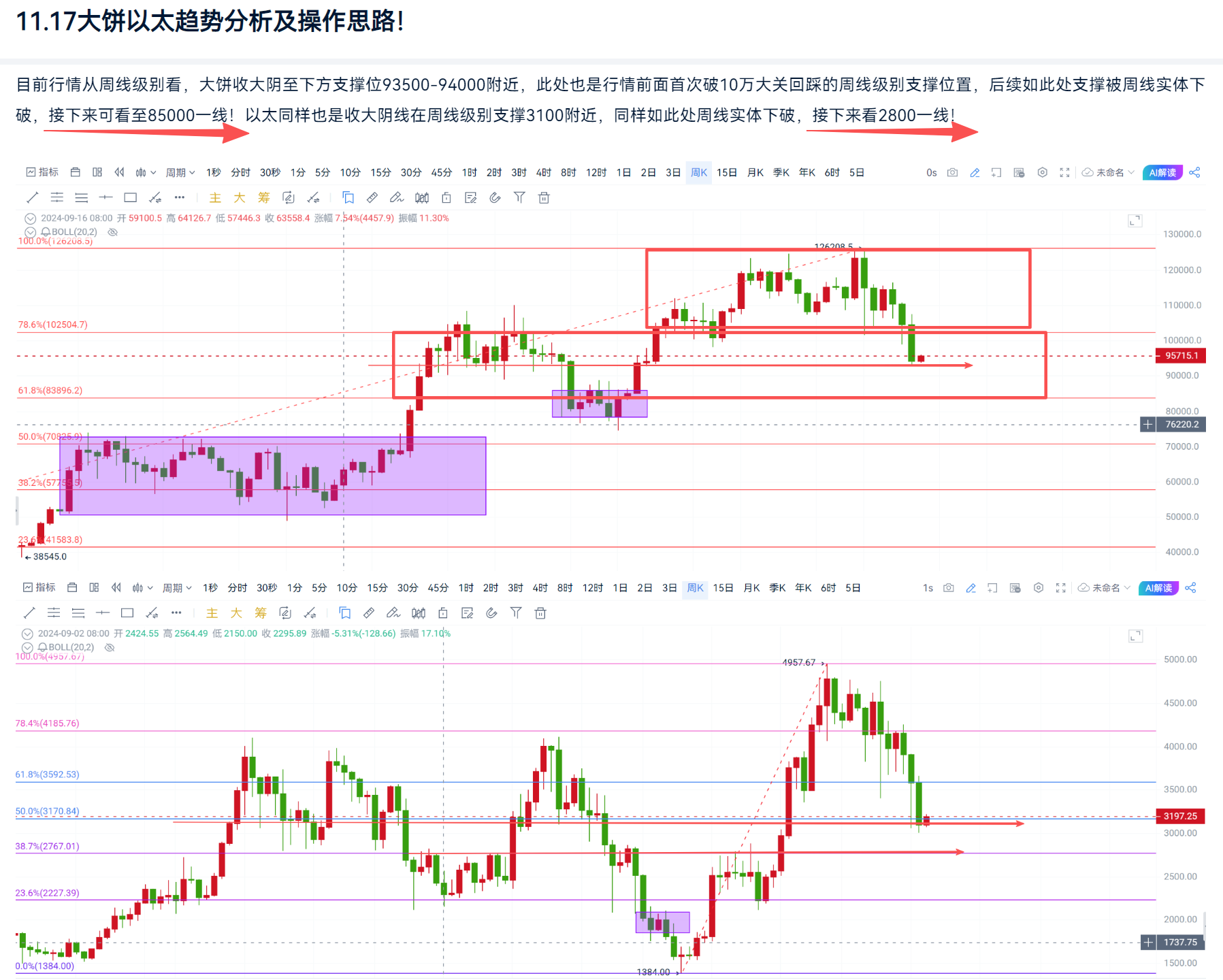 目前行情从周线级别看,大饼以太全部连阴直下,下跌后收线的位置基本与11.17发文预计一致,大饼84000,以太2800周线支撑附近,依照前面盘面来看,此处还是有一定支撑作用的,因此本周行情应以调整为主,后续行情延续空头还是趋势反转还需一步步去看!