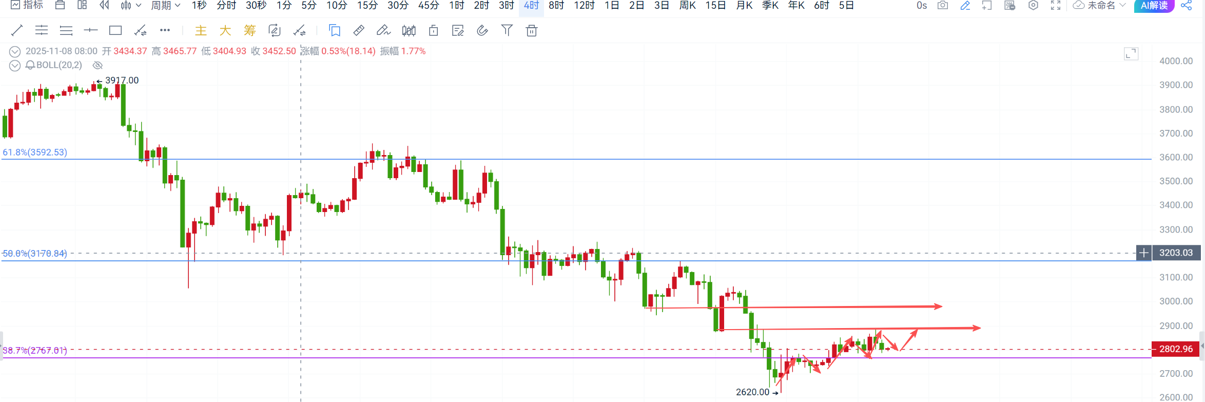 昨日分析目前行情空头趋势应暂告一段落,给出建议低位做多,可惜大饼预计回撤位置没有给到,以太拿下可观空间,后续可继续思路操作!