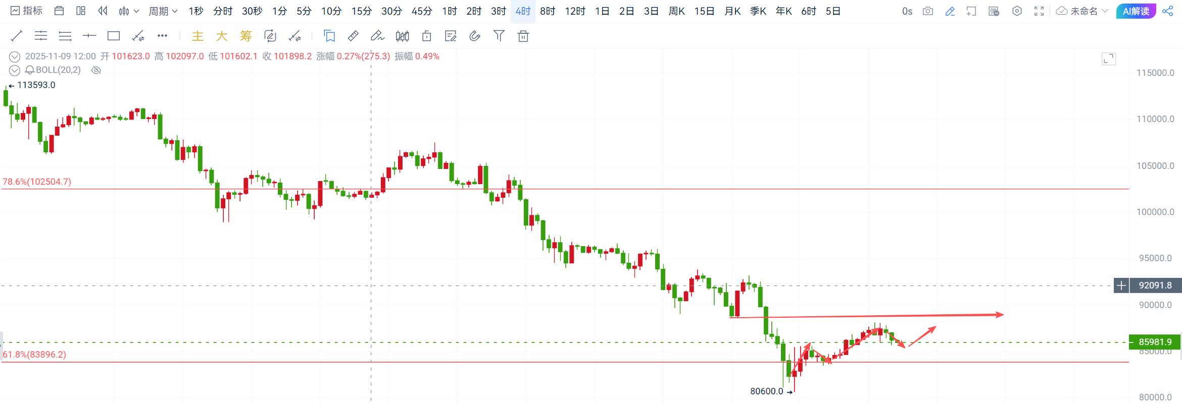 4小时级别,大饼目前走势继续呈现稳步上行姿态,上方压力87500,破位看89000-92500,支撑85000-84000,以太同步走势,节奏较慢,上方压力2850-2880,破位看2980-3030,支撑2760-2680!