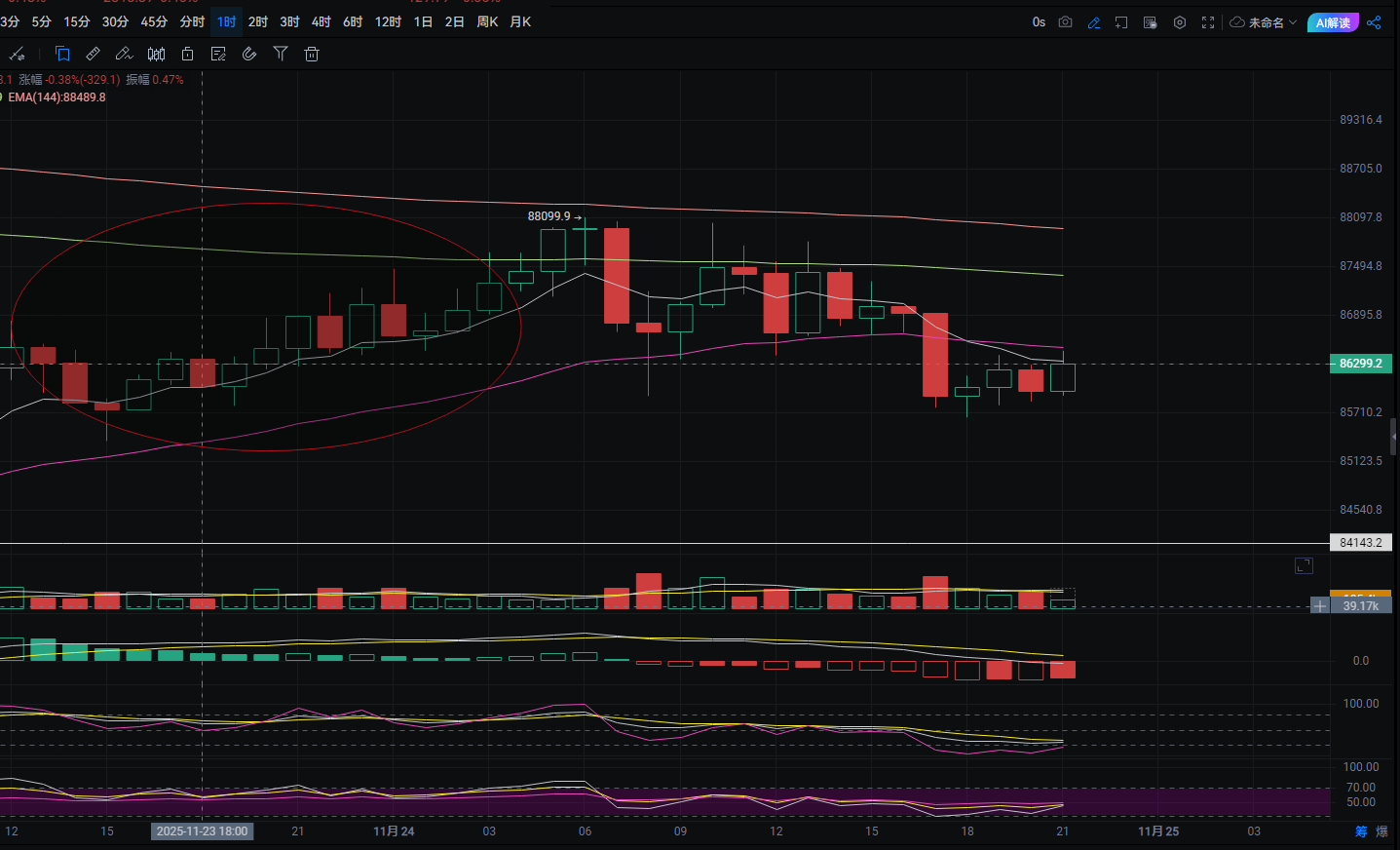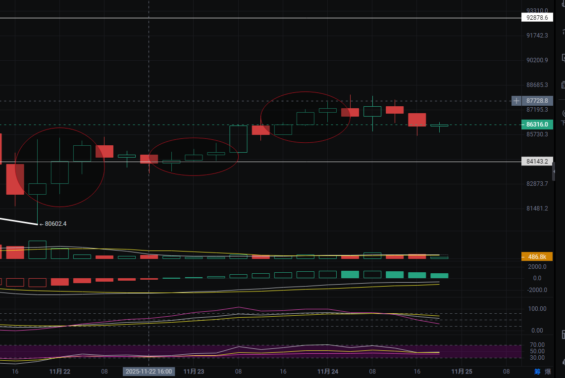 In fact, looking at the four-hour level, the recovery momentum can be felt more clearly. From 8 PM on the 21st to 4 AM on the 22nd, three one-hour candlesticks showed reduced trading volume and rising prices, with both indicators showing a golden cross at low levels, and MACD showing a bullish divergence. As it was the weekend, the market naturally saw reduced volume for recovery, and the overall process was dominated by bulls. In the early hours of the 22nd and 23rd, as well as the evening of the 23rd, there were three consecutive bullish four-hour candlesticks, indicating a tug-of-war. Bitcoin first rebounded to around 84000, then pushed up from the 84000 divergence point to around 88000. The overall process lacked strong trading volume, but this is a positive signal for future upward recovery.