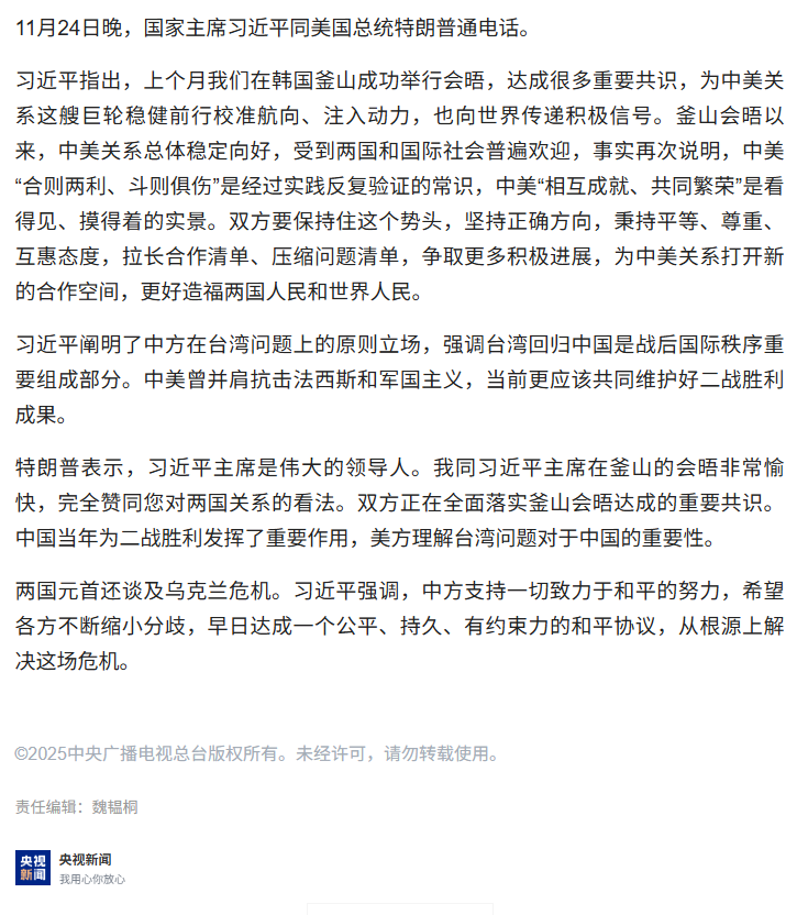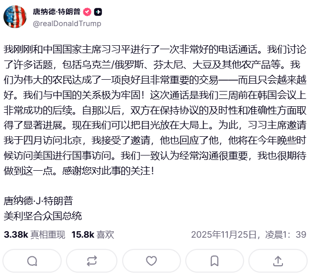 川普的新闻稿主要说的是中国和美国恢复正常贸易,尤其是美国最近闹的最凶的大豆和芬太尼,以及俄乌冲突的内容,顺带双方互相口头承诺去对方国家访问,从川普的文字来看,这是川普关税战的胜利。