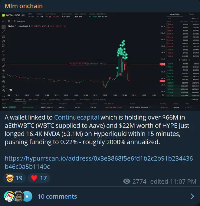 Recently, Continue Capital established a $3.1M long position in NVDA on trade.xyz, directly pushing the short-term annualized funding rate to an astonishing 2000%. KOL trader @CL207 complained, "This guy forced me to give up my position because at a yield rate of 0.2% per hour, I would have to pay $200,000 by Wednesday, which would bankrupt me."