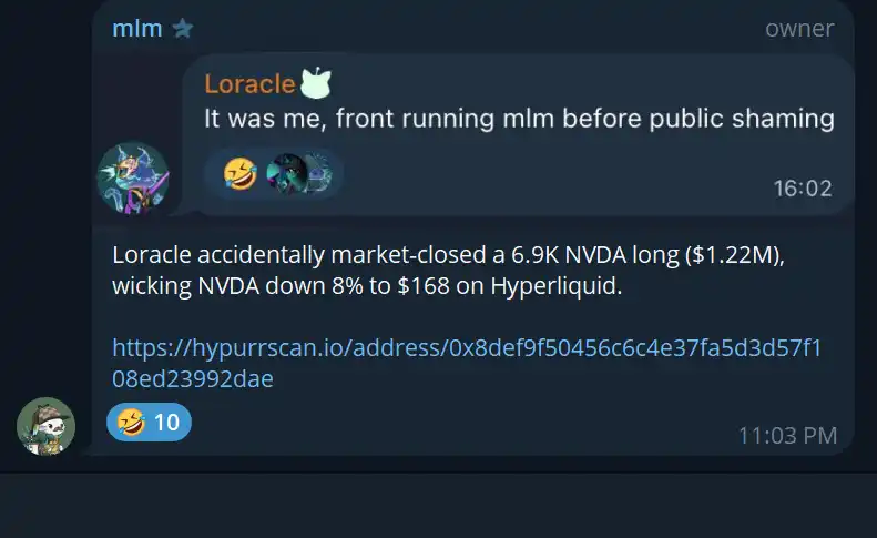 Another whale, Loracle, unexpectedly market liquidated a $1.2M long position in NVDA, causing the price to drop 8% instantly. If trade.xyz offers options with more than 13x leverage in the future, such instantaneous liquidity depletion will lead to countless traders being liquidated.