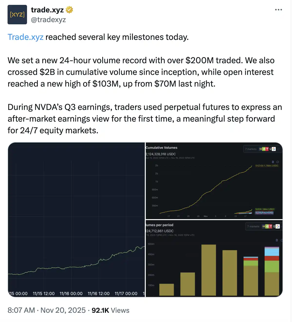 The PMF of U.S. stock perpetual contracts has been preliminarily validated. Data shows that trade.xyz's cumulative trading volume has surpassed $2 billion, with a record single-day trading volume of $200 million during the NVDA earnings report.