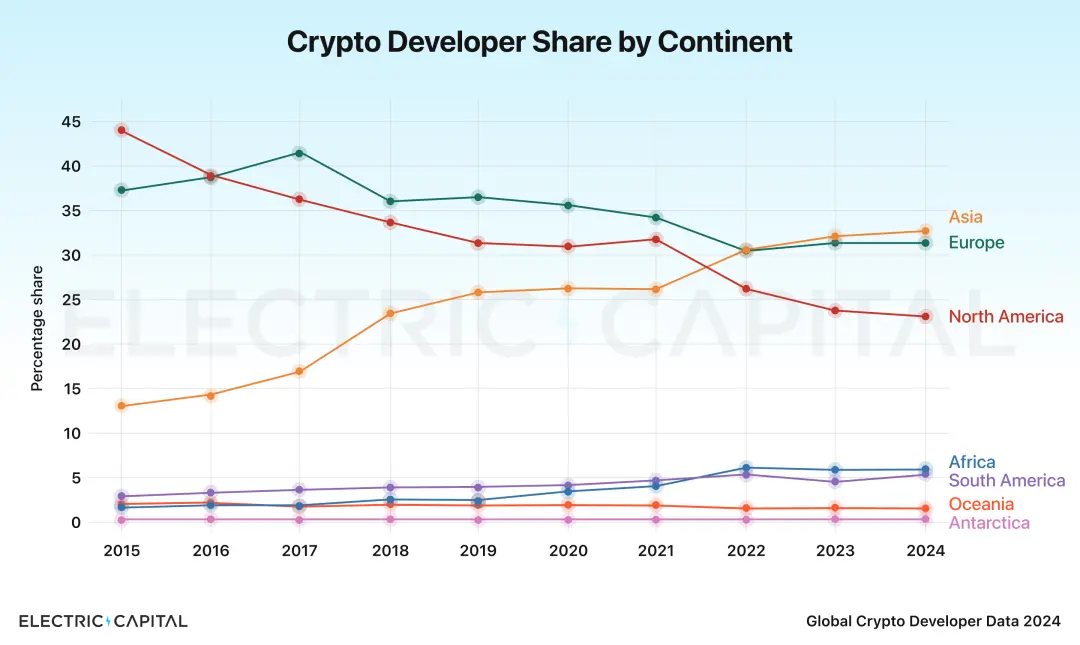 Electric Capital 2024年开发者报告显⽰,亚洲地区的区块链开发者占⽐⾸次达到32%,超越北美地区成为全球最⼤的开发者聚集地。