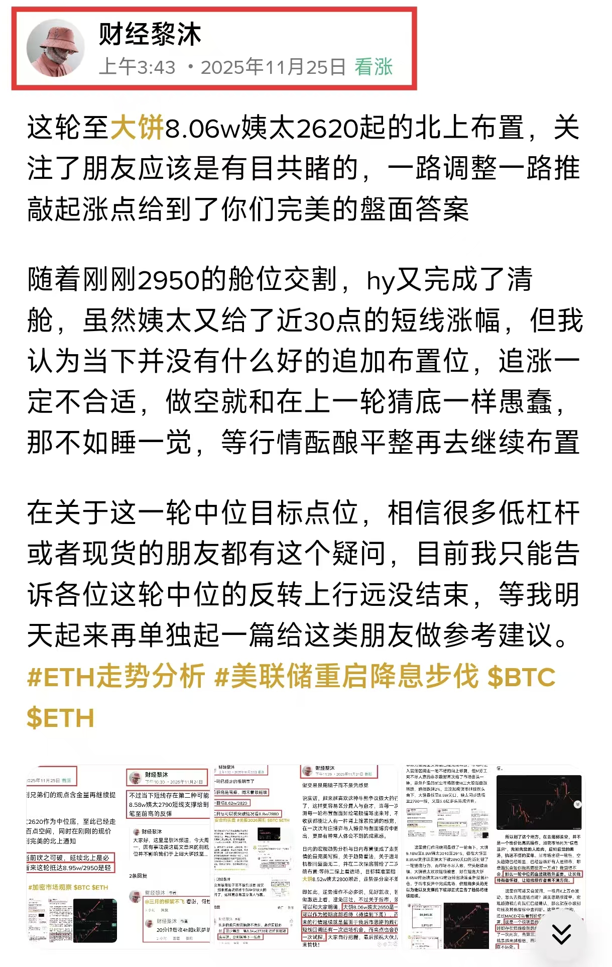Recently, the macro market has started to gradually warm up. We won't delve too much into the improving relations between the two parties, as it’s not convenient to discuss in depth. However, the recent dovish remarks from the FOMC have already been enough to boost confidence in the current trend, with the probability of a rate cut in December soaring to nearly 70%. Meanwhile, with the U.S. government resuming operations and the release of trillions of dollars in liquidity, regardless of where it flows, the boost to the overall financial market is unparalleled. If we consider this before the recent decline, it would undoubtedly signal the continuation of a bull market. However, under the current extreme panic in the market, the monthly line shows a weakening trend that has reversed. I can only tentatively view this as a mid-term upward trend while maintaining the viewpoint of a bull market continuation.
