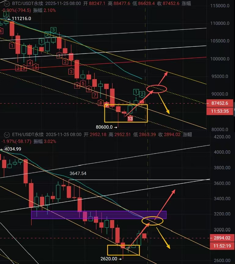 Looking back at the market, the structure has also released clear signals. First, regarding the support of the EMA21 at the monthly level mentioned earlier, and secondly, the signals released at the daily level. The daily candlestick and the two-day candlestick have both closed above the entity channel while providing a clear reversal at TD13. The weekly candlestick is approaching the MA120 support. Combined with the previous viewpoints, this is sufficient to support the upward trend in this round, with the primary target looking towards the daily resistance around 9.18W and the corresponding target around 3100. Based on the resistance situation and the macro market at that time, we will determine whether it is a new downward trend or a continuation of the bull market.