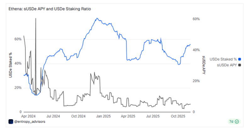 即便 Ethena 在今年 Q3 创下了 1.51 亿美元费用捕获的最高纪录,但事实上还是无法抵挡由于收益率大幅下跌导致的市场信心缺失。目前 USDe 的收益率虽然已经回升到 5% 以上,但总体的供应量和交易量都处于下滑状态。