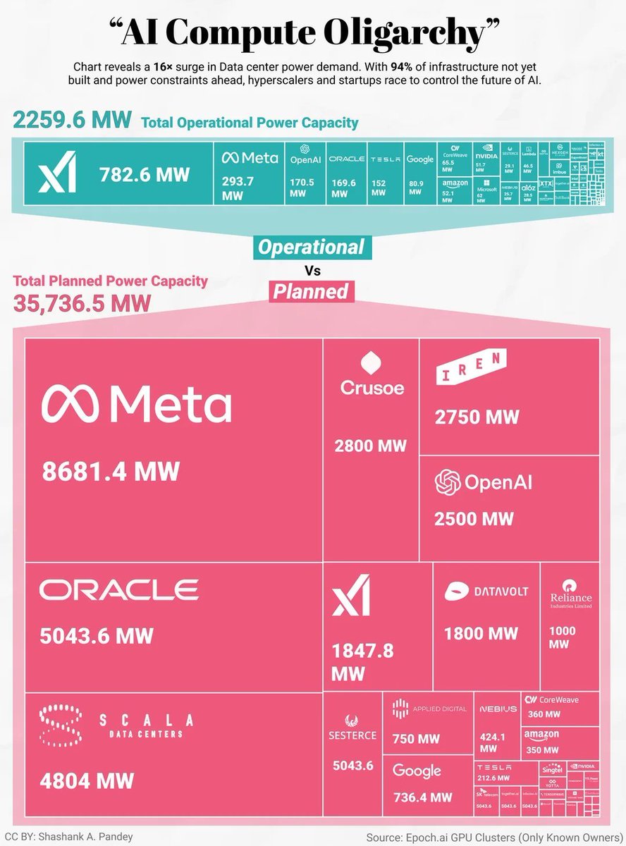 The total installed power generation capacity across the United States is approximately 1.2 billion kilowatts (i.e., 1,200,000 MW). The total electricity consumption planned by the future #AI giants is 35,736.5 MW.