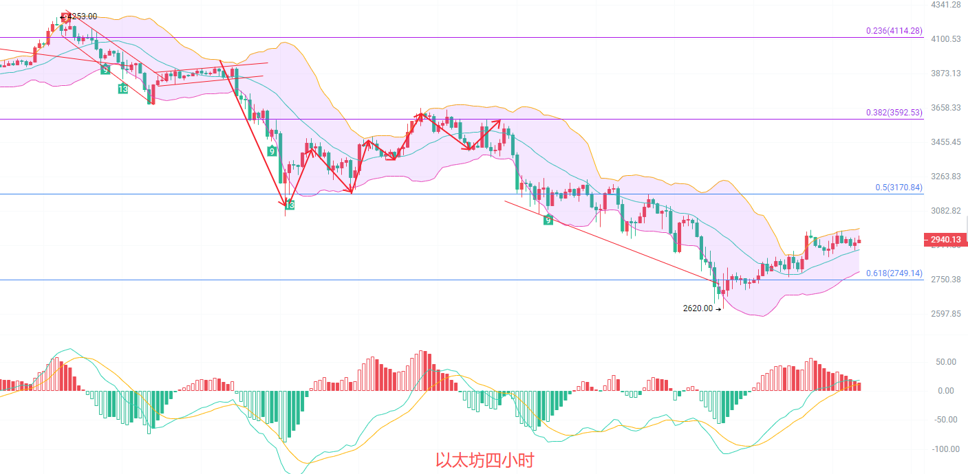 四小时K线三级跳,从2740第一阶段,到第二阶段2800,现在第三阶段2920,下一级在哪里,目前K线一直在试探上方EMA60压力位的强弱2955,压力位久攻必破,这是常识,MACD放量减少K线背离向上,不打脸上轨关注3000,下轨关注2785,南下和北上的位置建议看远一点,不要急着上车