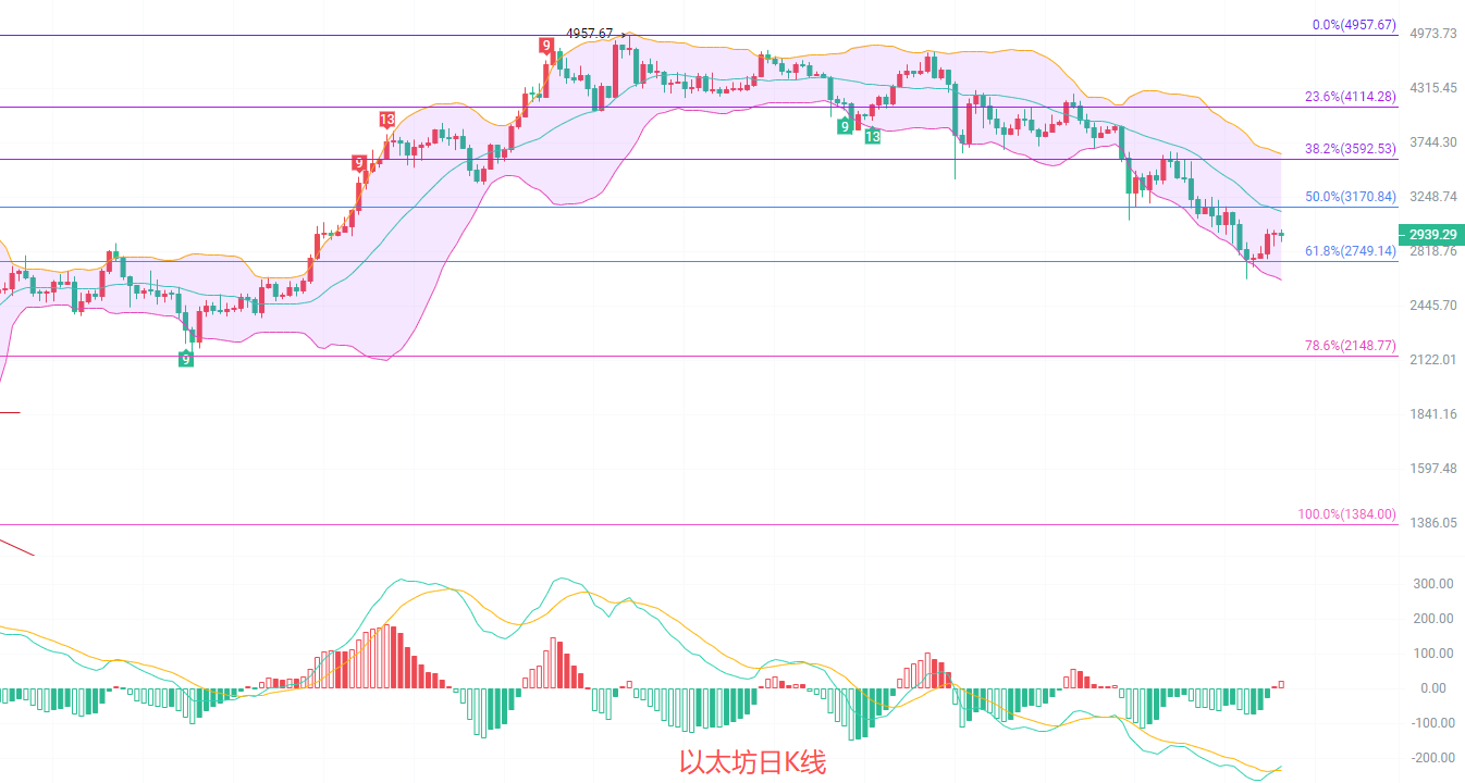 日K线最高2983,最低2887,EMA趋势指标依旧是大空趋势,EMA15趋势快线已经抵达了3030关口,MACD缩量结束开始放量上行,DIF和DEA也形成了金叉,布林带中规阻力关注3130,上轨3640下轨在2620,长线压制明显,短线看北上