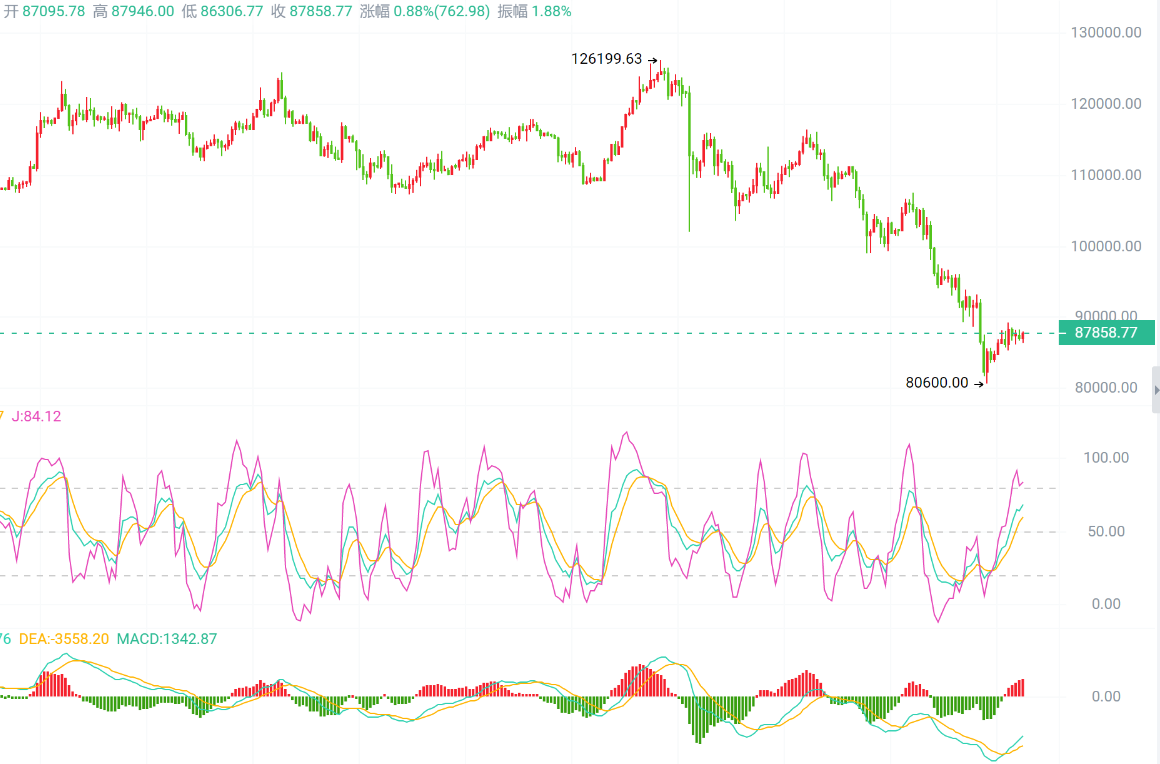 BTC:现价87800空,目标86300,破位看85000一线