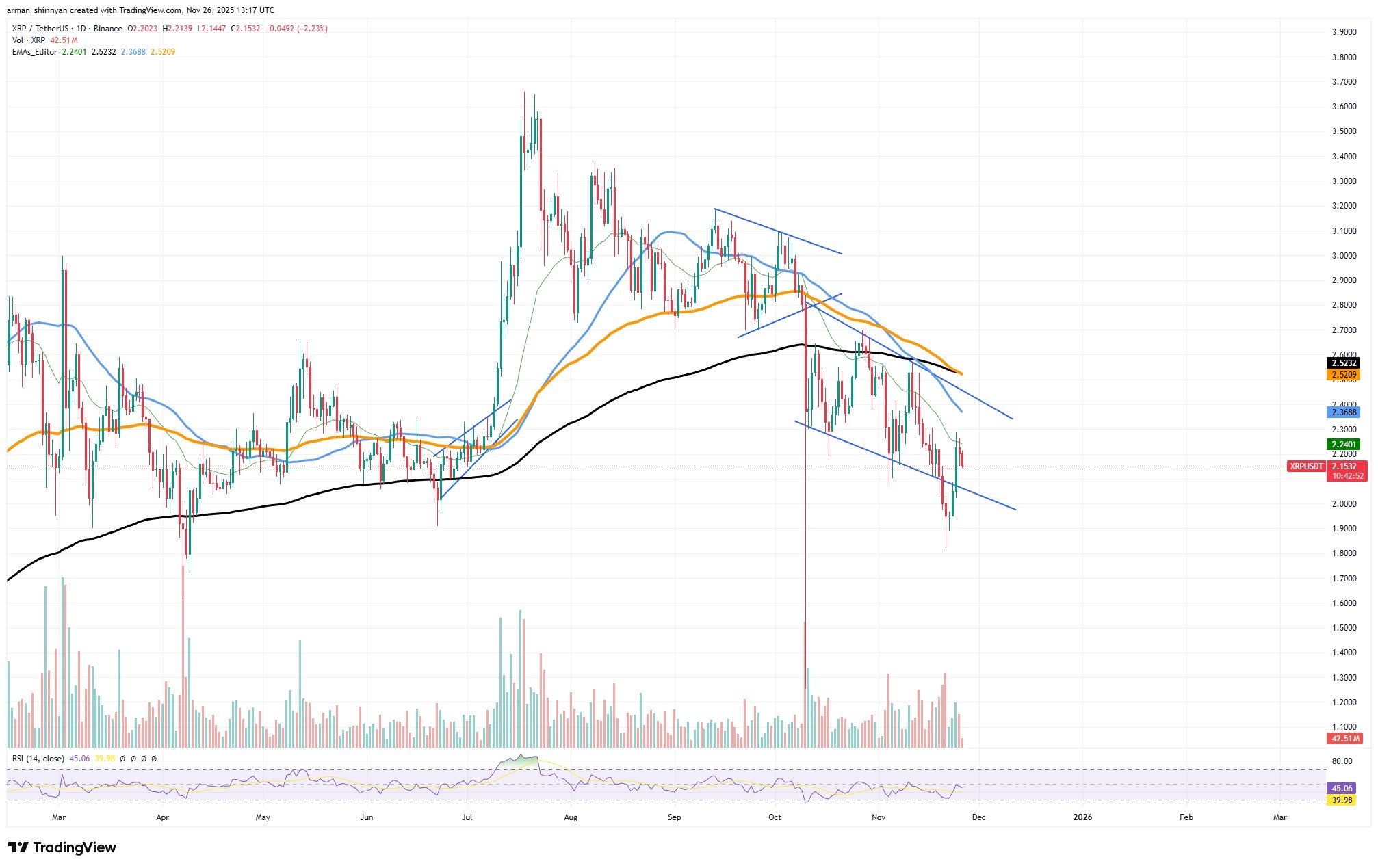 因此,XRP可能会进一步恢复。如果买家继续进入市场,结构允许价格向2.30-2.40美元漂移。然而,现在要求3美元并不是分析,而是纯粹的狂热。该资产尚未恢复任何一个重要的移动平均线,最近几天损失了近30%,并且仍然困在一个下降通道中。