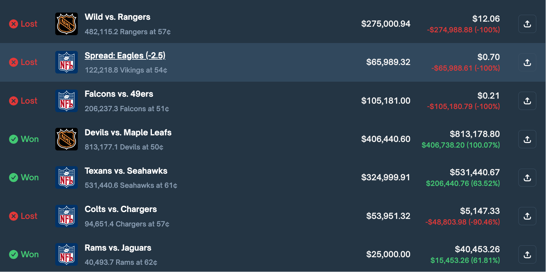 - 在 NHL 比赛 Capitals 对阵 Canadiens 一事中,其再次 ALL IN,投入 120 万美元买入盘前胜率更高的 Canadiens,最终未进行及时止损,近 120 万美元全部亏完,一周之内,其个人盈亏数据表现就已由盈转亏至 -380 万美元。