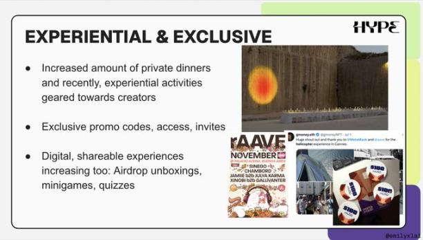 门票获取方式趋向层级化、独家化和序列化营销激活。数字化体验也在增加:空投开箱、迷你游戏、Buzzfeed 式可分享性格测试等。更多灵感源自 Web2 品牌活动、快闪概念和网红活动,并被引入加密领域。