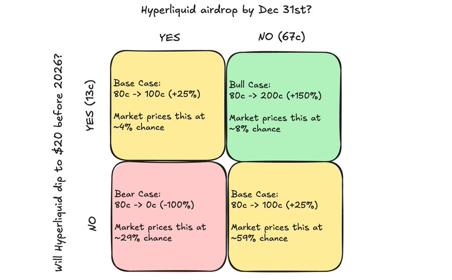 - 如果 Hyperliquid 进行空投且价格保持在 20 美元以上,你将血本无归。鉴于市场非常关注团队解锁带来的新供应,空投进一步增加市场供应似乎会遭到强烈反对。这种情况发生的概率应该低于 29%,因此你是在高位卖出一个你认为不合理的可能性。
