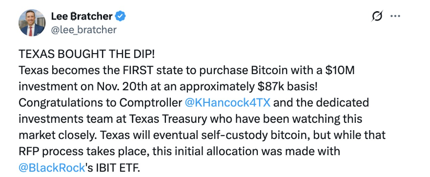 Early this morning, Lee Bratcher, president of the Texas Blockchain Association, announced that the state has officially launched its Bitcoin reserve program and has completed its first purchase of a $5 million BlackRock Bitcoin spot ETF (IBIT). At this moment, the cold market sentiment seemed to hear the crisp echo of ice cracking.