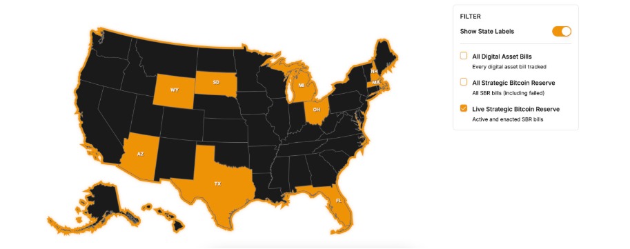 However, the legislative process has not been smooth sailing. Most states have stalled after proposals, with some bills even being withdrawn or directly rejected, leaving very few that have entered substantive stages. According to Bitcoin Laws, as of now, only three states in the U.S. have officially passed state-level strategic Bitcoin reserve bills, namely Arizona, New Hampshire, and Texas. Apart from these three states, only Florida, South Dakota, Wyoming, Michigan, Ohio, and Massachusetts are still advancing SBR bills.