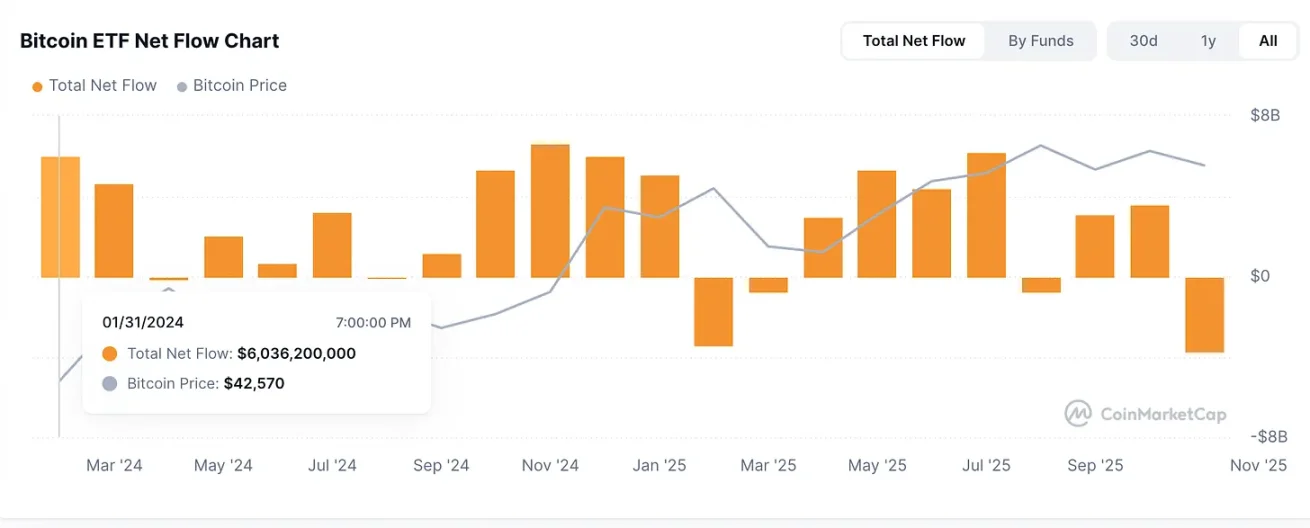 Here you can see that most of the positive gains and losses come from 2024, while almost all ETF fund flows in 2025 are in a loss state (except for March). Considering that the largest monthly inflow occurred in October 2024, when Bitcoin's price had already reached $70,000.