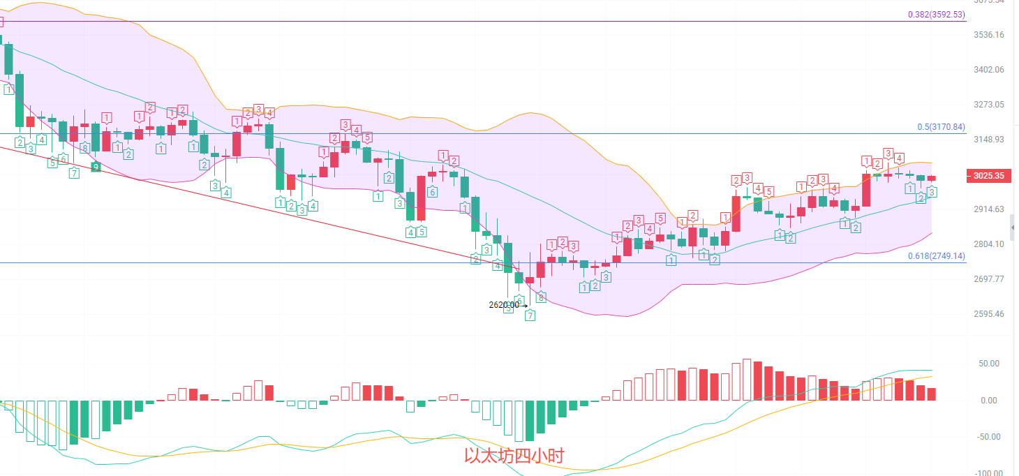 四小时K线表现更为明显,K线已经进入了短期的上升通道,通道支撑关注布林带中规2956,和上轨3070,MACD出现顶部背离的行情,连续放量减少K线背离上行,多头有很大概率在经过几天的横盘以后继续向上突围,思路上已经在低位持有北上筹码的币友建议继续持有,没有持有的观望